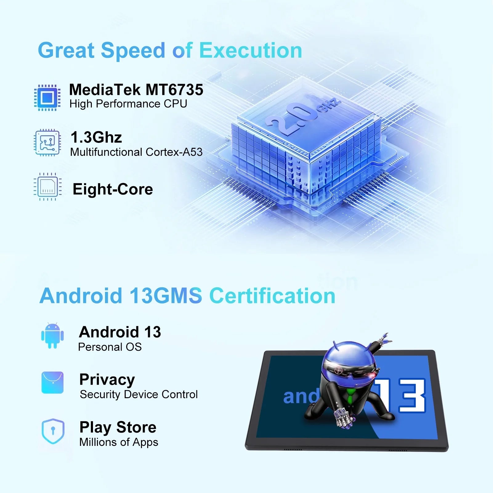 The tablet featuring GMS Google certification Android 13, With the latest octa-core processor and is upgraded to support 5G+2.4G WiFi. This Android tablet offers high-fast app launching, super smooth gaming, and an amazing multimedia experience.