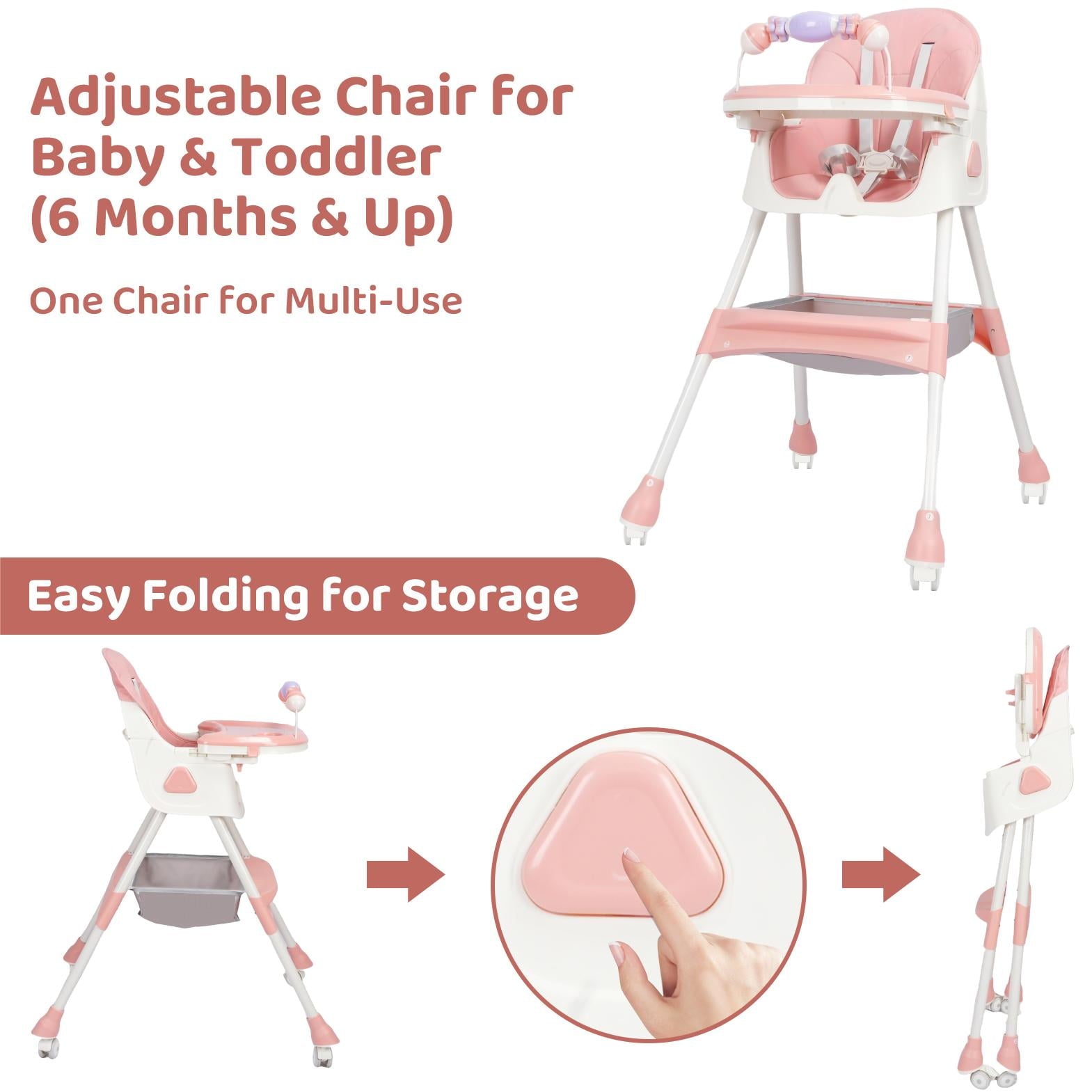 4-in-1 Baby High Chair, Convertible High Chair for Babies and Toddlers, Portable Folding Dining Chairs Eat & Play with Five-Point Harness, Double-Layer Dinner Plate, Toy Rack, Spoon, Fork, Bowl, Pink