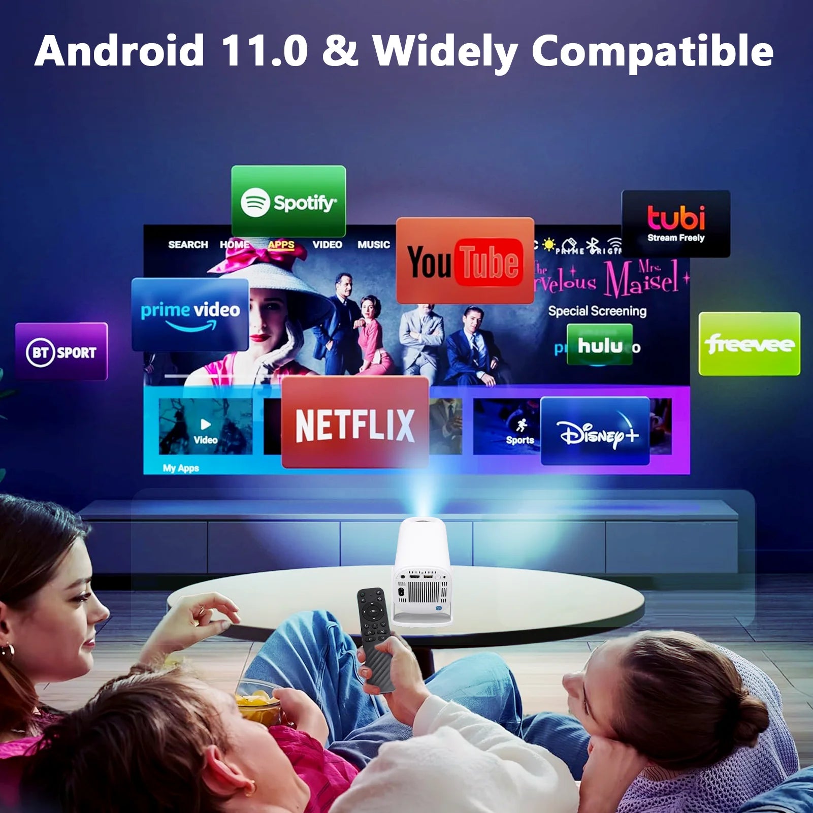 Our mini projector with the latest Android TV 11.0, no need to buy additional costly equipment, you can easily watch Prime Video, Netflix, YouTube and other 8000+ channels and videos that you like, enjoy a movie night with your family or friends.